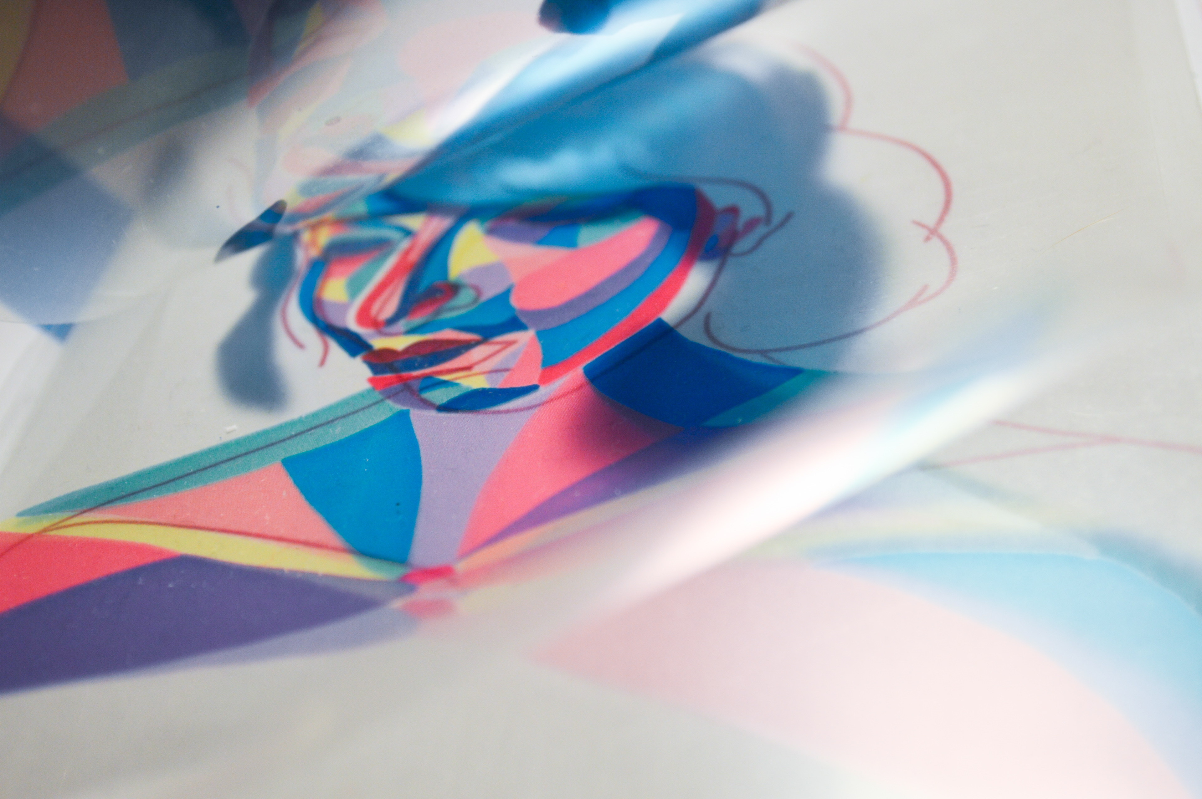 Projet de livret sur ma vision des couleurs, particulièrement dans les portraits. Impression sur acétates de différentes couches de couleurs pour que le lecteur puisse construire le portrait lui-même en superposant les feuilles.